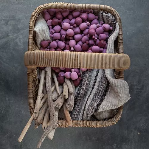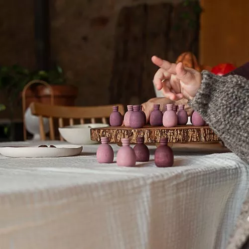 Een set van 36 houten ananassen ‘Mandala Pinyes’ van het Spaanse merk Grapat. De speelgoedananasjes liggen prettig in de hand en zijn tevens prachtige decoratiestukken voor bijvoorbeeld seizoenstafels.