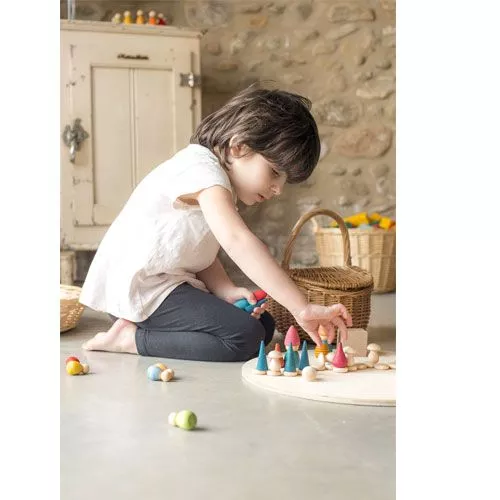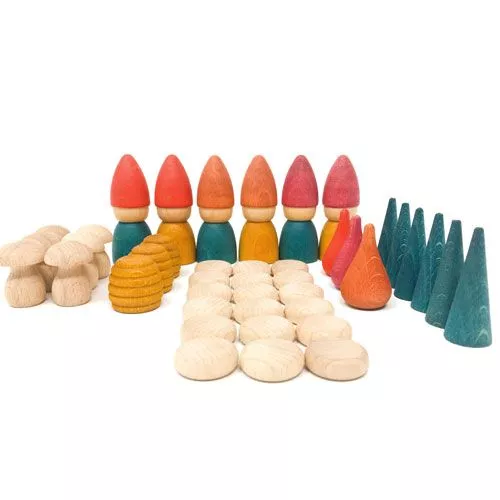 De Nins® poppetjes roepen met hun puntmutsen een sprookjeswereld op. Met de verschillende onderdelen zoals schijfjes, paddenstoeltjes, boompjespionnen en bijenkorfjes kan deze kabouterset mooi gecombineerd worden met schatten uit het bos zoals takjes en mos en vormen zo een mooi een afwisselend decor op tafel of op de grond. Speelgoed wat de natuur in huis brengt.