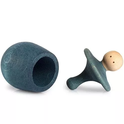 Een houten poppetje in een bakje ‘Little Things Blau’ van het Spaanse merk Grapat om mee te spelen en kleine schatten in te verstoppen.