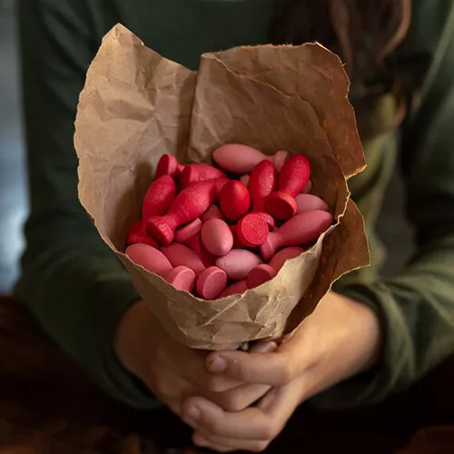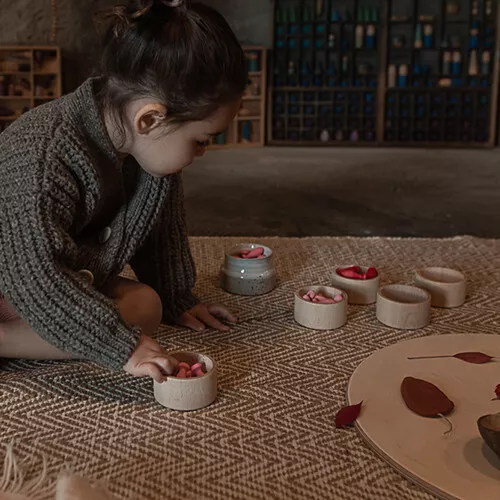 Een set van 36 houten bloemblaadjes ‘Mandala pètals’ van het Spaanse merk Grapat. De speelgoedfiguren liggen prettig in de hand en zijn tevens prachtige decoratiestukken voor bijvoorbeeld seizoenstafels.