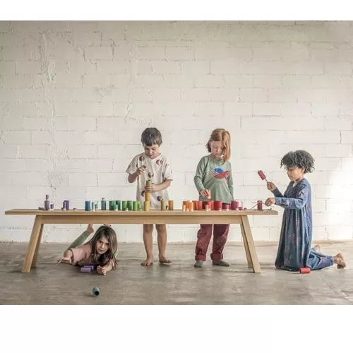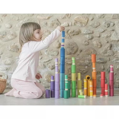 De kleurrijke houten figuren en blokken hebben ieder een cilindervorm: sommige zijn groot, andere klein, open of dicht en passen wel of niet in elkaar. Multifunktioneel speelgoed, dat de creativiteit stimuleert en het vermogen onderscheid te maken tussen vorm en kleur.