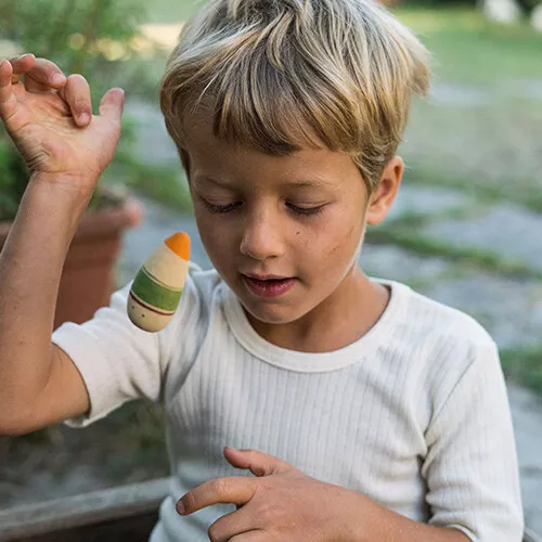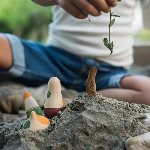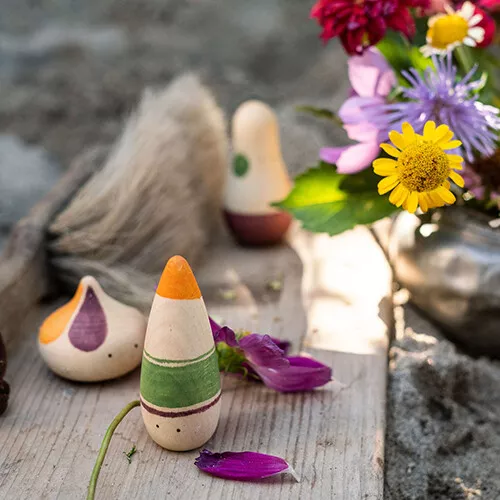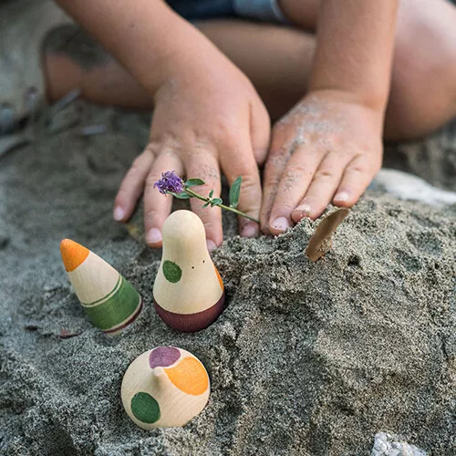 Drie abstract vormgegeven speelfiguren ‘Ooh-la-la!’ uit de serie ‘Wild’ van het Spaanse merk Grapat die de fantasie prikkelen en uitnodigen tot het maken van verhaaltjes.