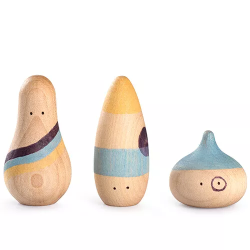Drie grappige, abstract vormgegeven speelfiguren ‘Wow!’ uit de serie ‘Wild’ van het Spaanse merk Grapat die de fantasie prikkelen en uitnodigen tot het maken van verhaaltjes.