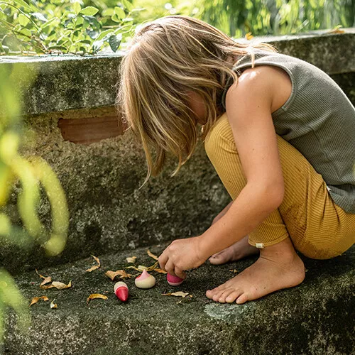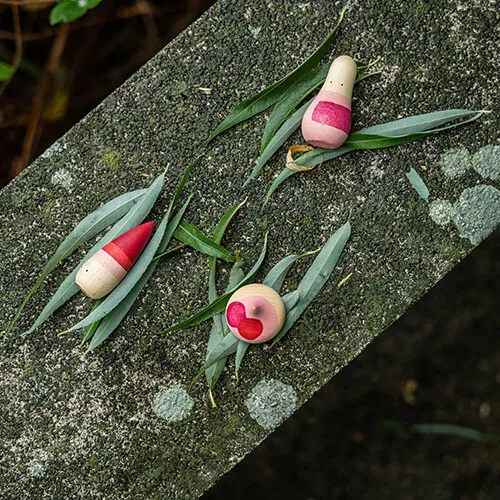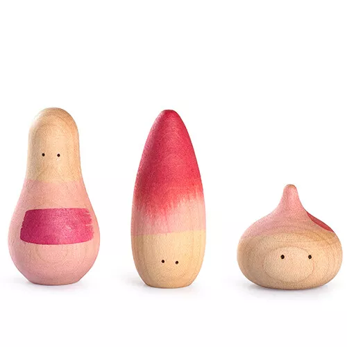 Drie vriendelijke, abstract vormgegeven speelfiguren ‘Yay!’ uit de serie ‘Wild’ van het Spaanse merk Grapat die de fantasie prikkelen en uitnodigen tot het maken van verhaaltjes.