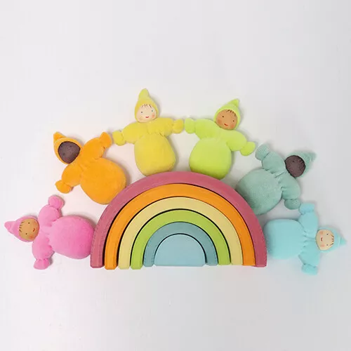 Een set van zes stoffen kabouters ‘Pastell Taschenzwerge’ van het Duitse merk Grimm’s. De kleine dwergpoppetjes voelen zich overal thuis; in het poppenhuis, op de commode, in de schooltas, op de decoratie tafel. Het zijn kleine geluksbrengers.