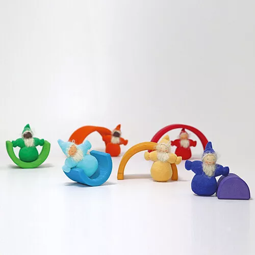 De set van de kleurrijke, bebaarde poppetjes biedt heel veel speelmogelijkheden bij ander speelgoed van Grimm’s: op een stapeltoren, rotsen en riffen.