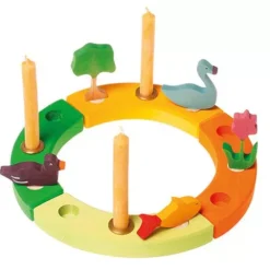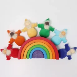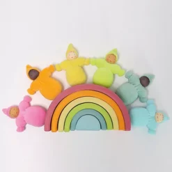 Een houten set ‘Rainbow Forest’ van het Duitse merk Grimm’s met 12 boomtoppen in verschillende hoogten en in regenboogkleuren. Zo kan in elk seizoen een bos gebouwd worden. In combinatie met ander bouwspeelgoed worden het spitse torens en daken.