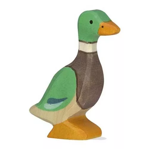 Een kleine houten mannetjeseend uit de boerderijserie van het Duitse merk Holztiger. De eend met afgeronde hoeken ligt prettig in kinderhanden.