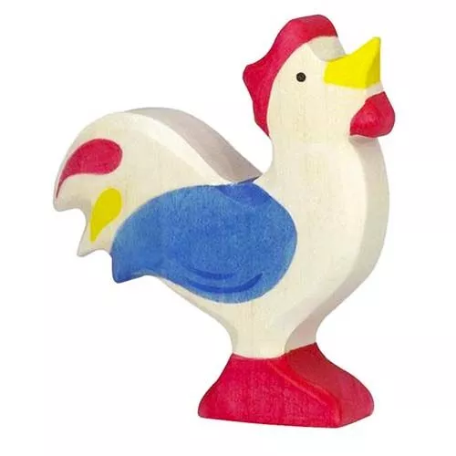 Een houten haan uit de boerderijserie van het Duitse merk Holztiger. De haan met afgeronde hoeken ligt prettig in kinderhanden.