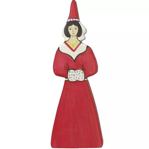 Een houten jonkvrouw met rode jurk uit de sprookjes en ridders serie van het Duitse merk Holztiger. Speelgoed dat mooi mee kan doen in een riddertafereel of om zomaar in de kast ten toon te stellen.