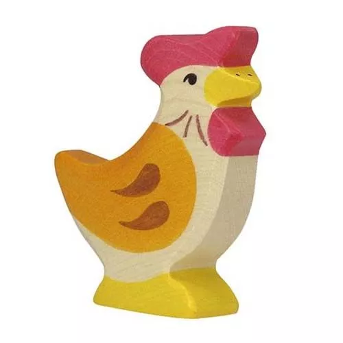 Een kleine houten kip uit de boerderijserie van het Duitse merk Holztiger. De speelgoed kip met afgeronde hoeken ligt prettig in kinderhanden.