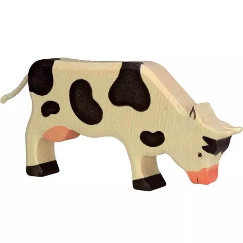 Een grazende koe uit de boerderijserie van het Duitse merk Holztiger. De speelgoed koe met afgeronde hoeken ligt prettig in kinderhanden.