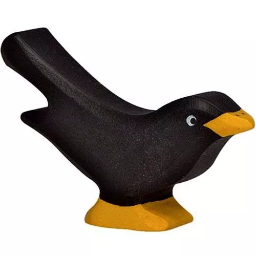 Een kleine houten merel uit de bosdieren serie van het Duitse merk Holztiger. De speelgoedvogel met afgeronde hoeken ligt prettig in kinderhanden.