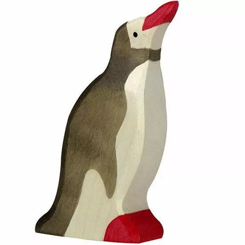 Een houten pinguÏn met opgeheven kopje, uit de zeedieren serie van het Duitse merk Holztiger. Speelgoed dat onderdeel kan uitmaken van een tafereeltje, seizoentafel of om zomaar tentoon te stellen.