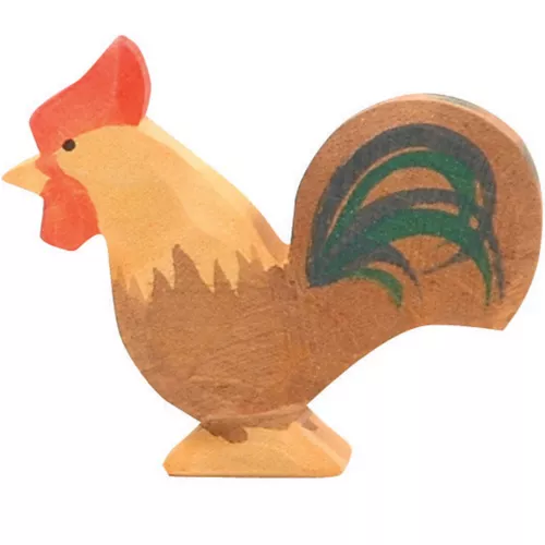 Een houten haan met sierlijke groene pluimenstaart van het Duitse merk Ostheimer. Speelgoed dat met de hand gemaakt en beschilderd is.