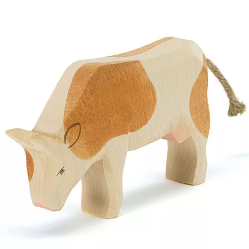 Een houten bruin gevlekte koe met een staart van touw van het Duitse merk Ostheimer. Mooi speelgoed dat met de hand gemaakt en beschilderd is.