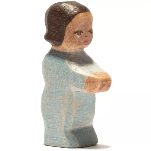 Maak de speelgoedfamilie compleet met deze peuter van het Duitse merk Ostheimer. Het houten speelfiguur met bruin haar en een blauw pakje is met de hand gemaakt en beschilderd. Mooi op de speeltafel, in het poppenhuis of als onderdeel van een gezellig boerderij tafereel.