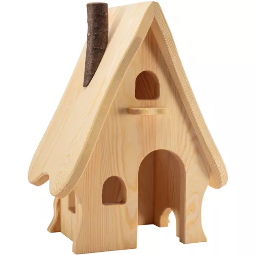 Het speelhuis heeft een deuropening, verschillende raampjes en een boomstammetje als schoorsteen op het dak.